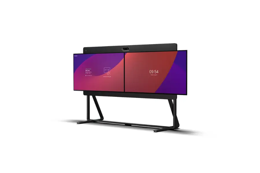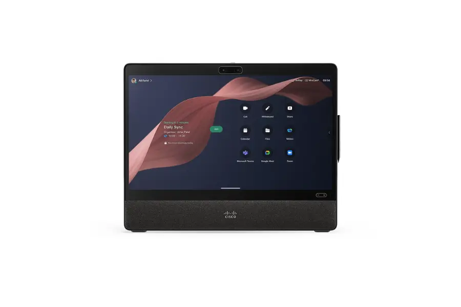 Cisco Desk Pro G2 is a premium all-in-one video collaboration device featuring a 27-inch 4K touchscreen display, a 48MP AI-powered camera, and an 8-microphone beamforming array