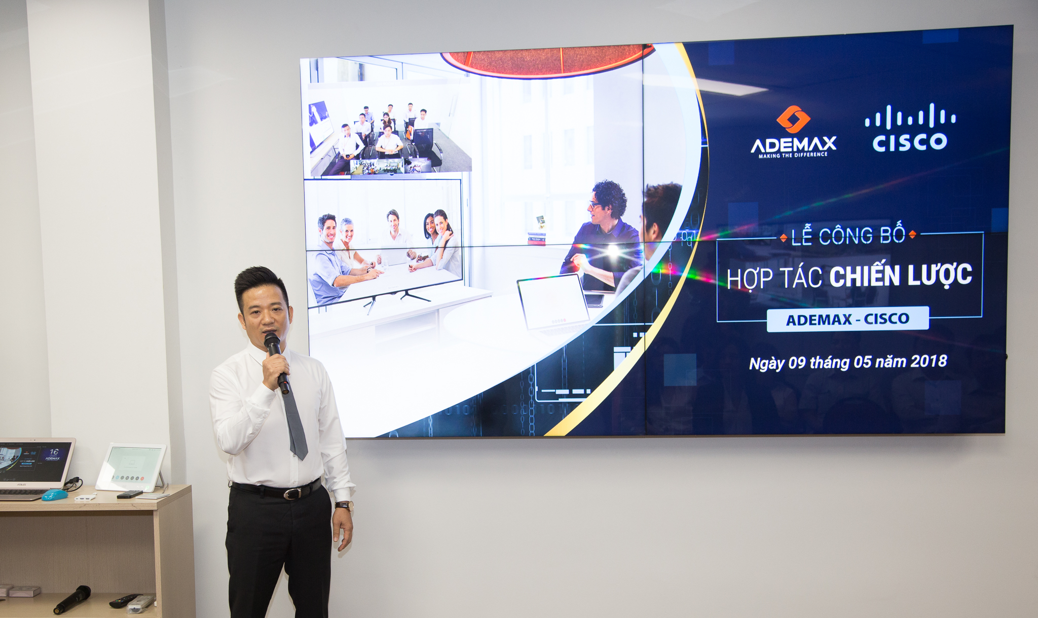 Với bài phát biểu khai mạc sự kiện của mình, ông Nguyễn Danh Thuận – Tổng giám đốc Công ty Cổ phần Ademax cho biết, 16 năm trong ngành, mặc dù đã hợp tác với hơn 10 hãng công nghệ danh tiếng trên thế giới, tuy nhiên, xu thế và nhu cầu từ thị trường đã thúc đẩy Ademax tìm kiếm một đối tác về Hội nghị truyền hình có thương hiệu uy tín, nền tảng công nghệ mạnh mẽ đủ để đáp ứng mọi nhu cầu về giải tần sản phẩm từ cá nhân đến doanh nghiệp lớn để có thể mang lại cho khách hàng những trải nghiệm hoàn hảo. Và ông Thuận khẳng định Cisco chính là sự kết hợp hoàn hảo cho sứ mệnh không ngừng cung cấp các công nghệ mới nhất và hữu ích nhất trong lĩnh vực AV cho người dùng của Ademax.